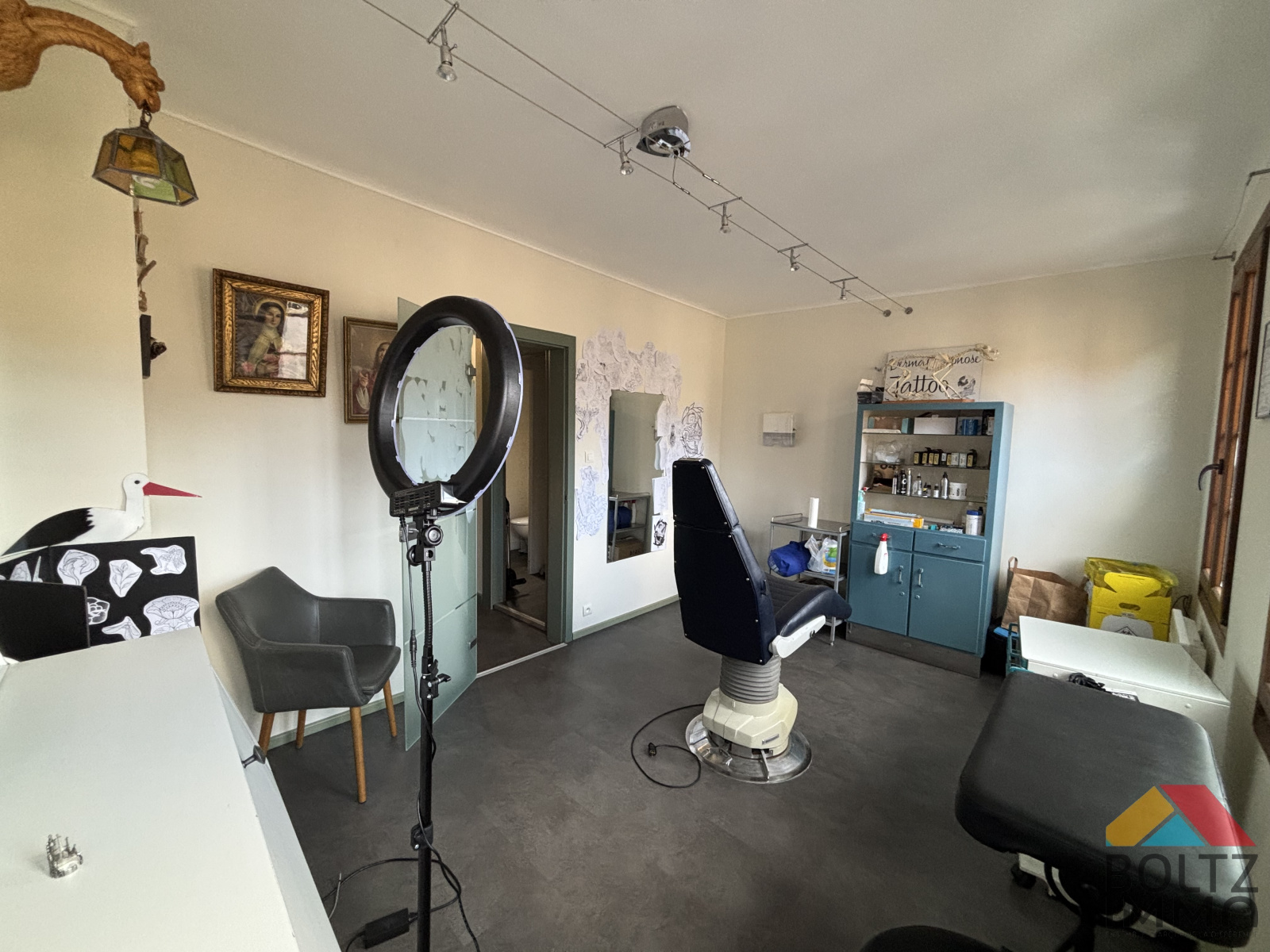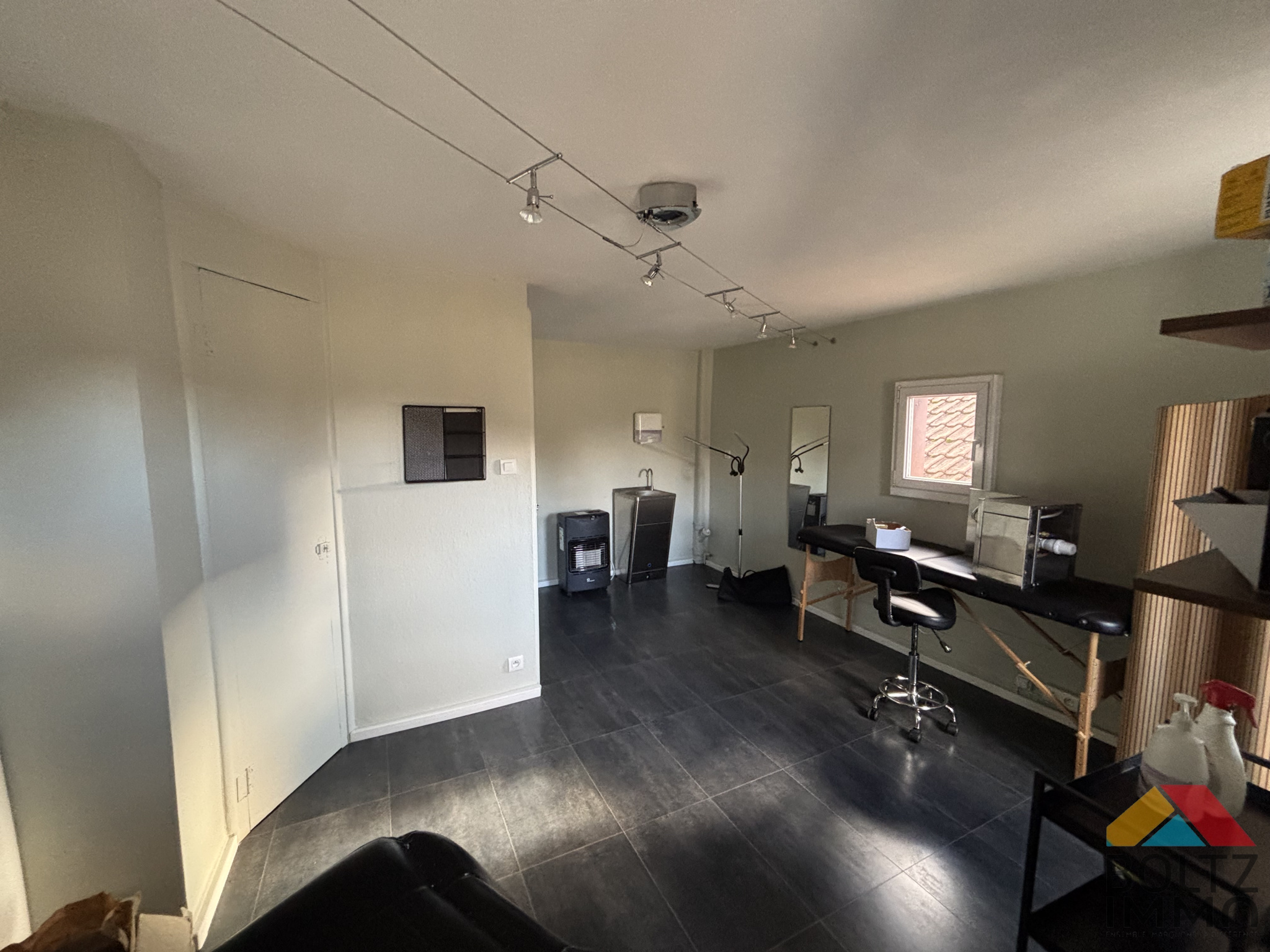 - Pièce principale et débarras pour une surface totale de 19,59 m², offrant un espace flexible pour bureaux ou showroom.