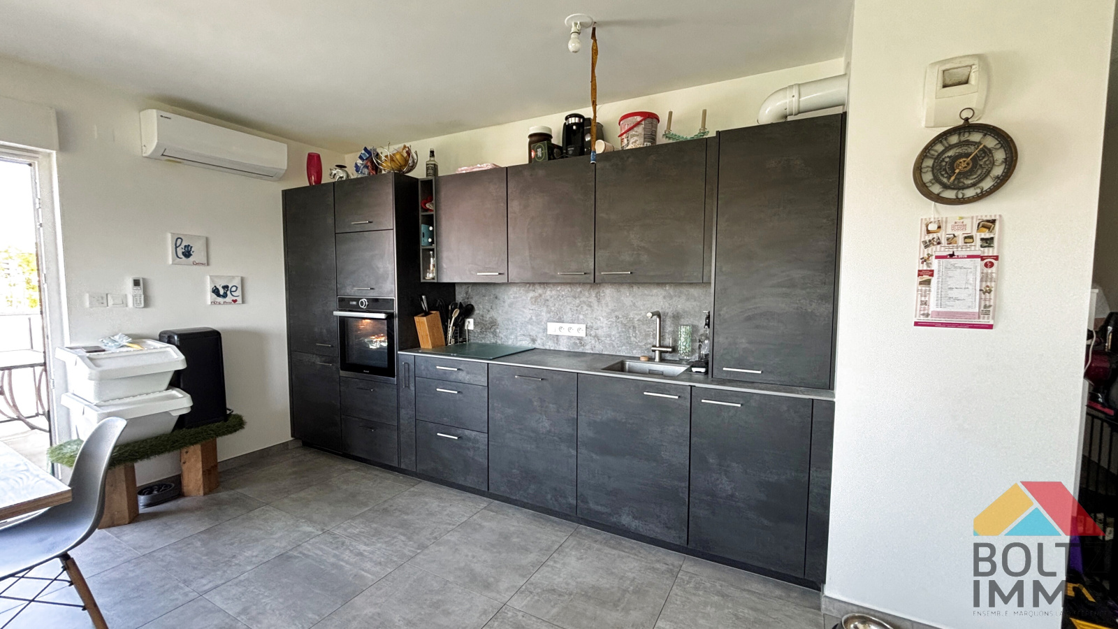 Il comprend, une entrée avec placards, une cuisine toute équipée (four, plaque de cuisson, hotte, réfrigérateur/congélateur, lave-vaisselle) ouverte sur le salon/séjour avec accès terrasse, 2 chambres dont une avec accès terrasse, une salle d'eau équipée avec douche à l'italienne, et un wc séparé.